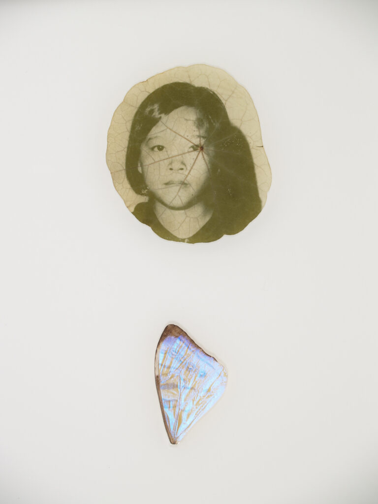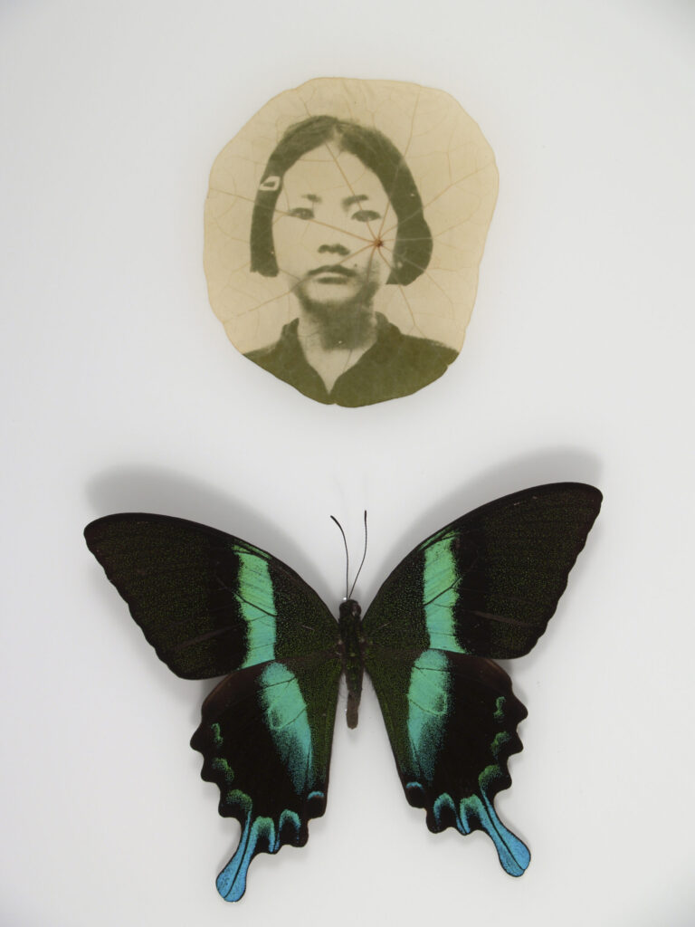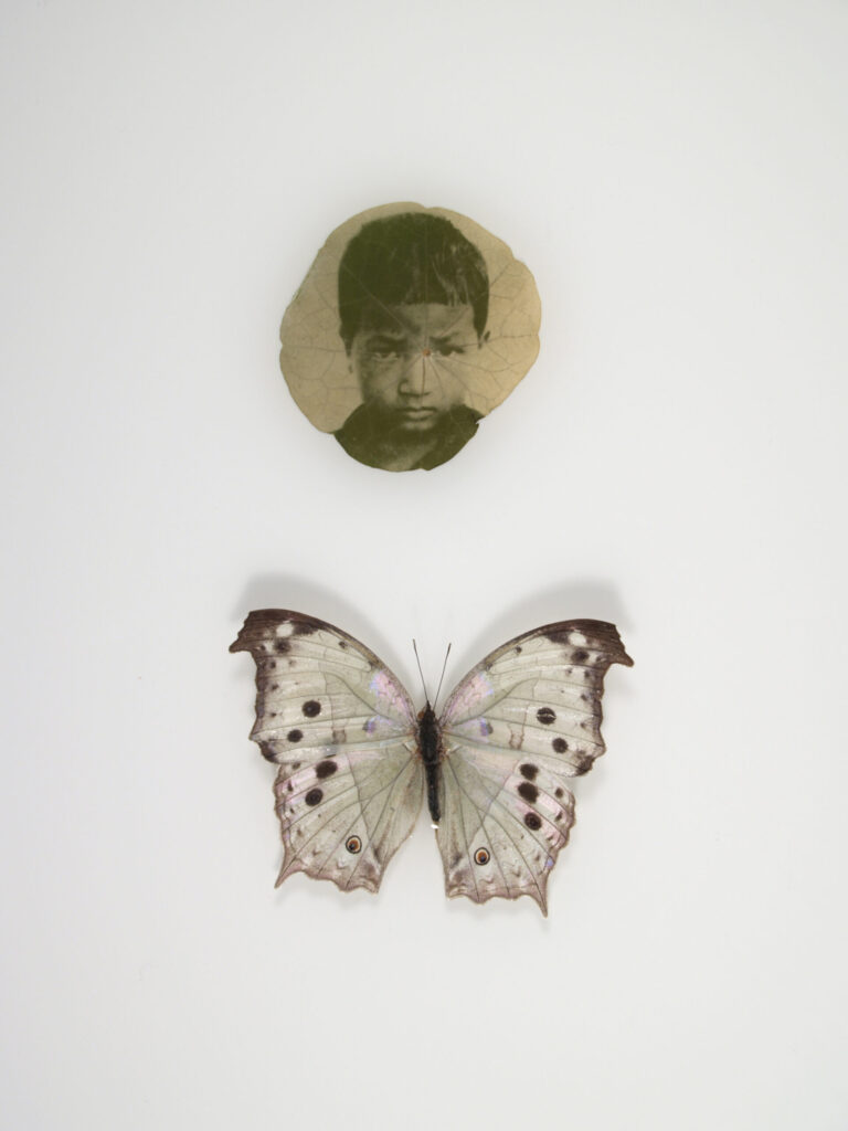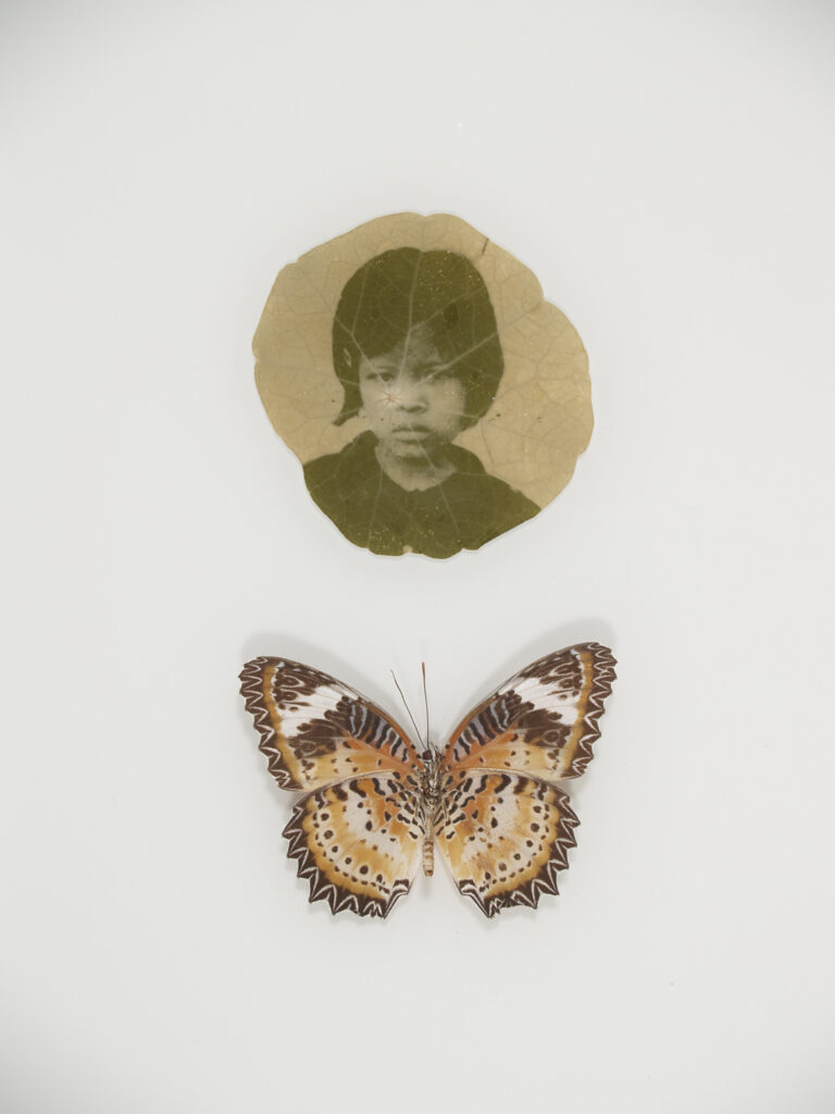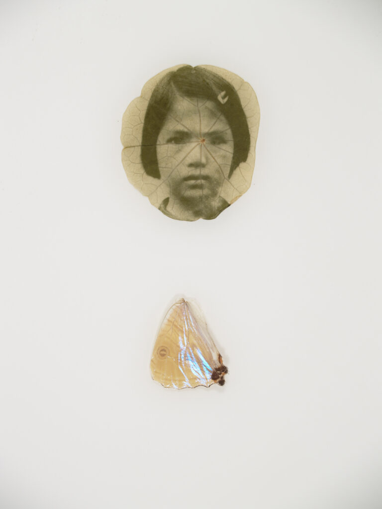 Chlorophyll print on nasturtium leaves, butterfly specimens, & resin