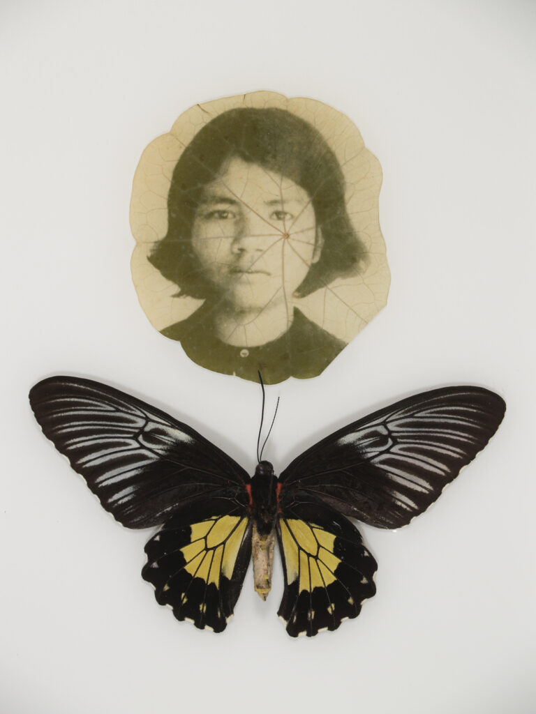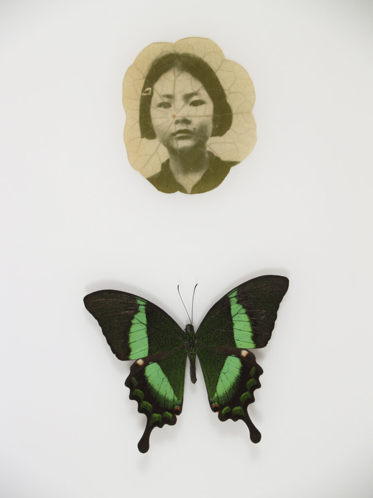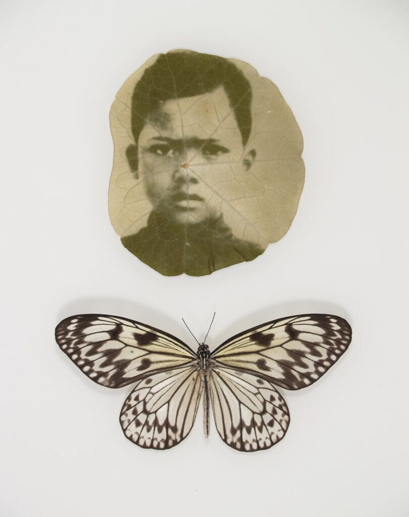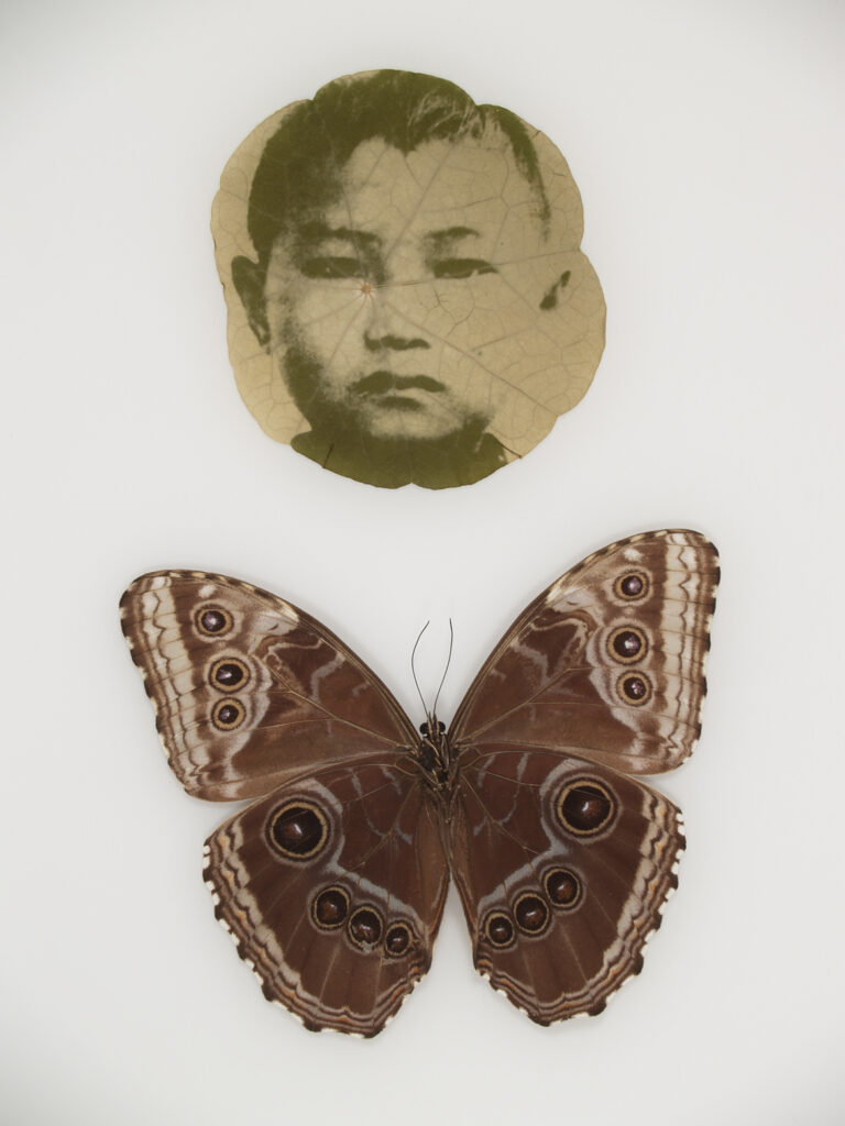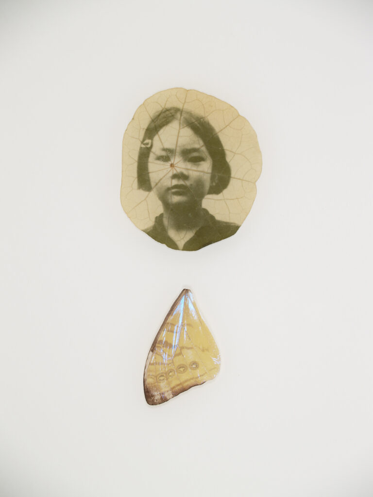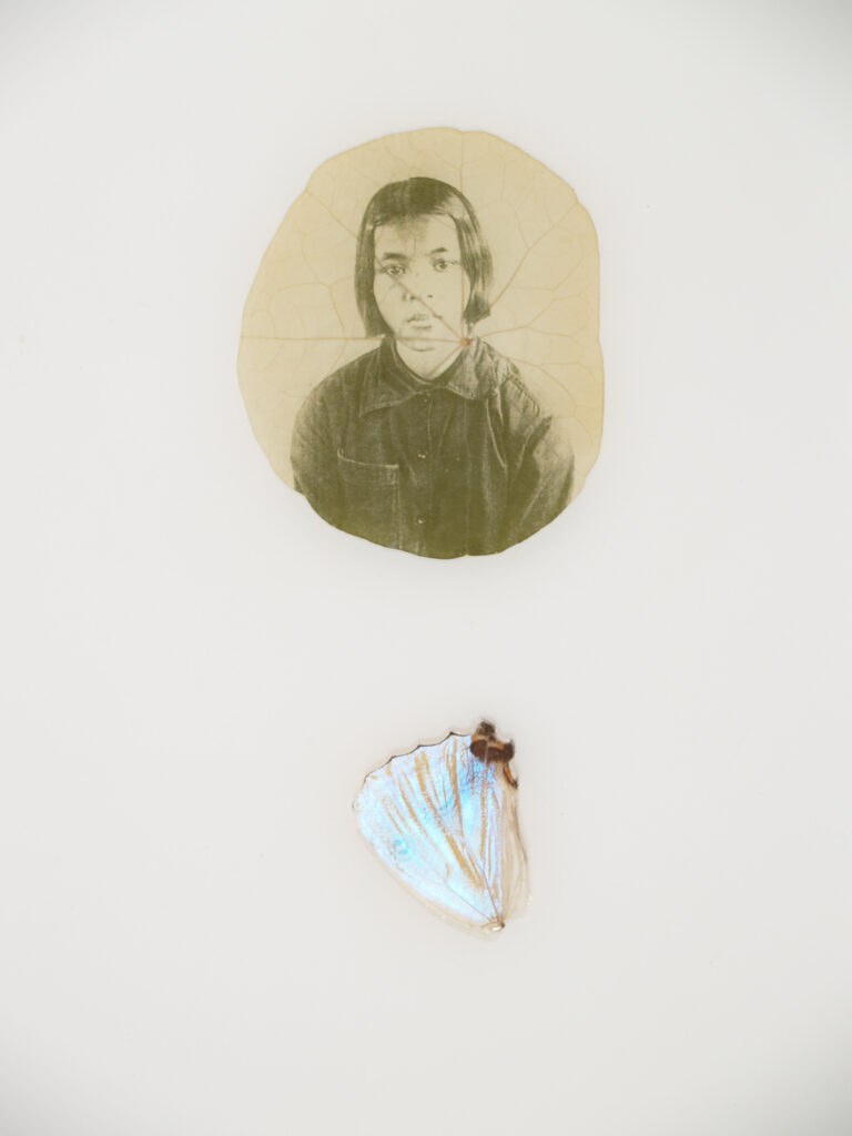 Chlorophyll print on nasturtium leaves, butterfly specimens, & resin
