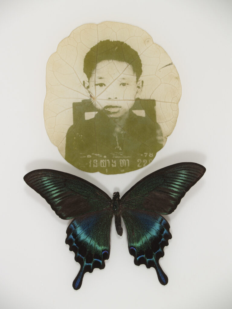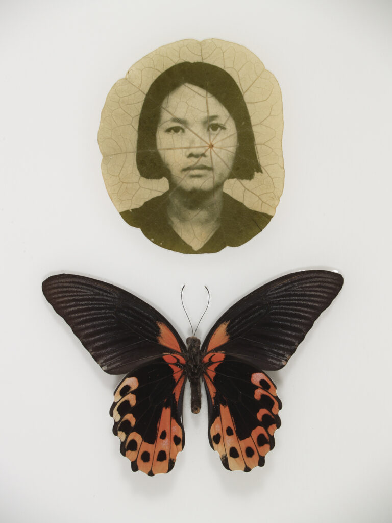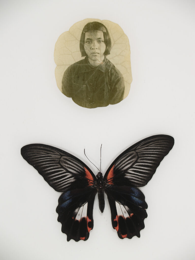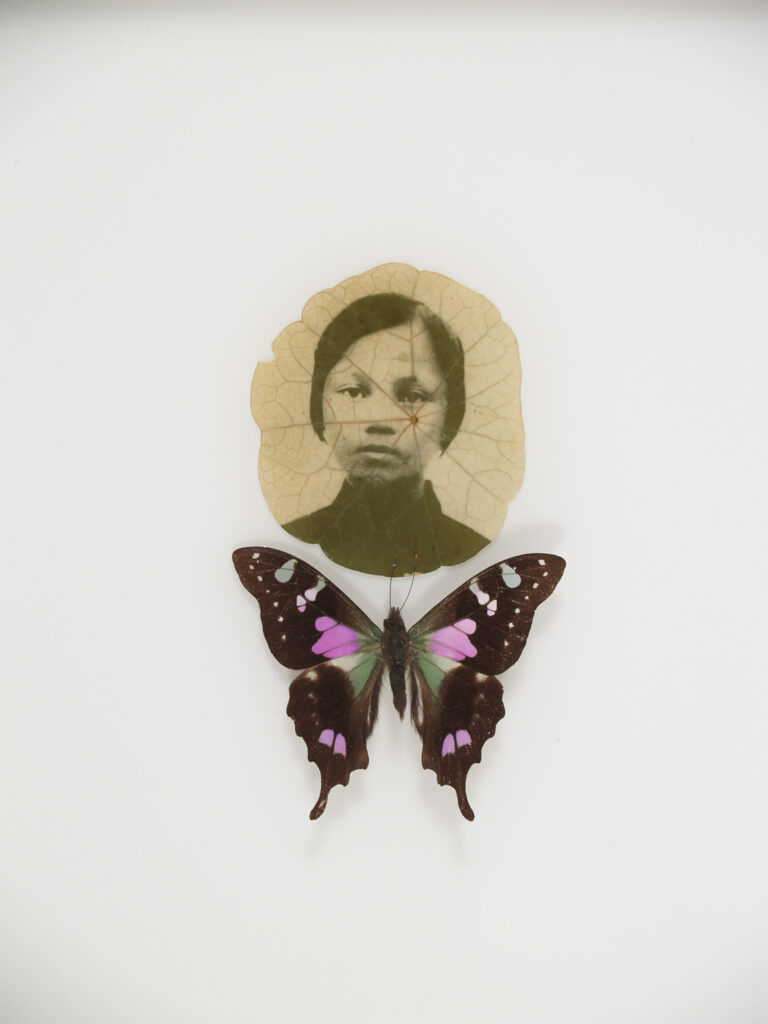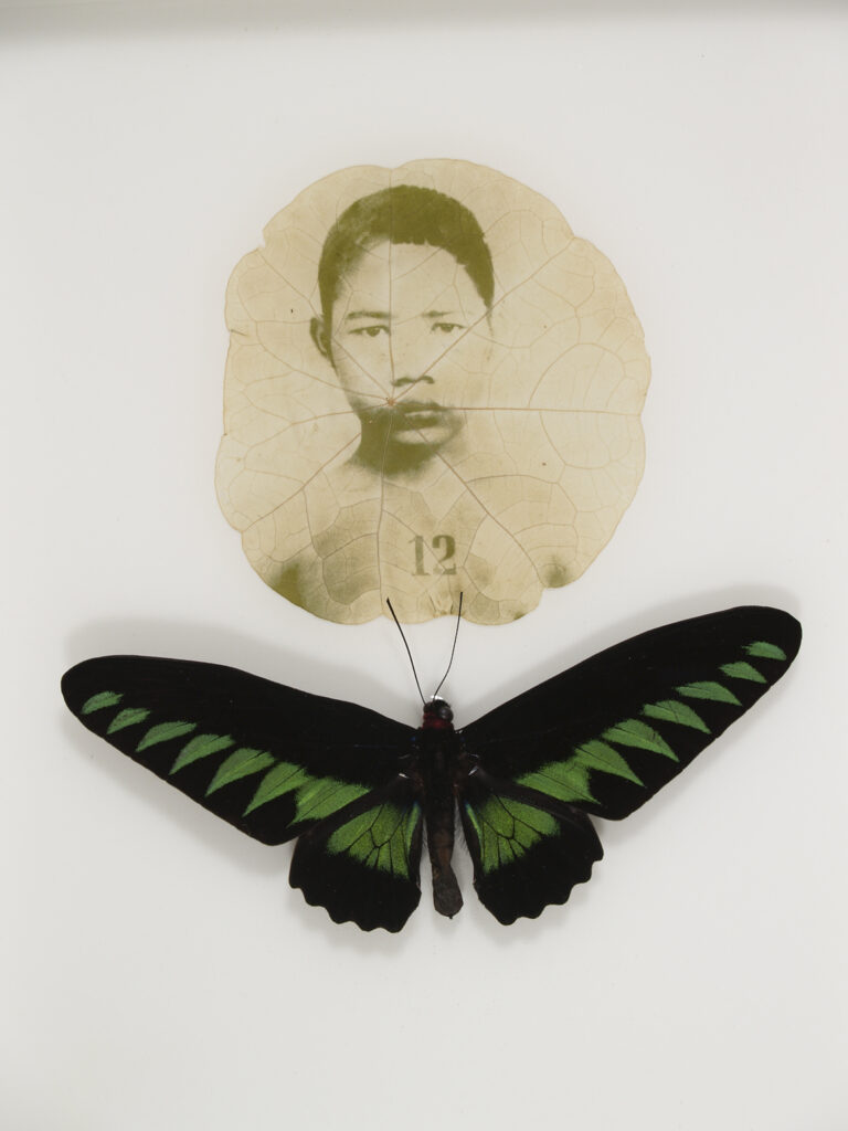 Chlorophyll print on nasturtium leaves, butterfly specimens, & resin