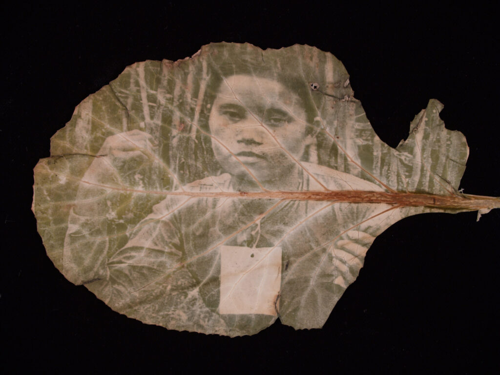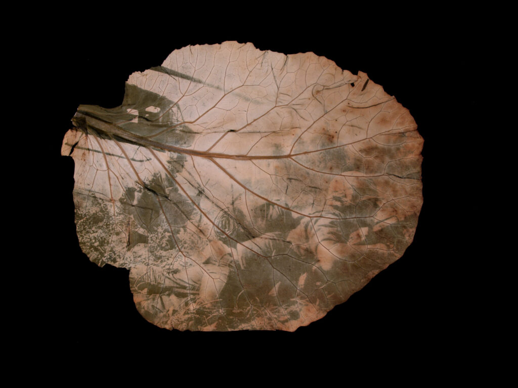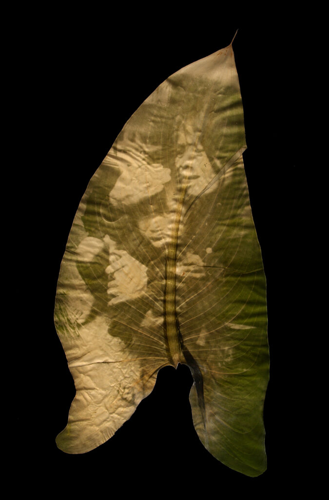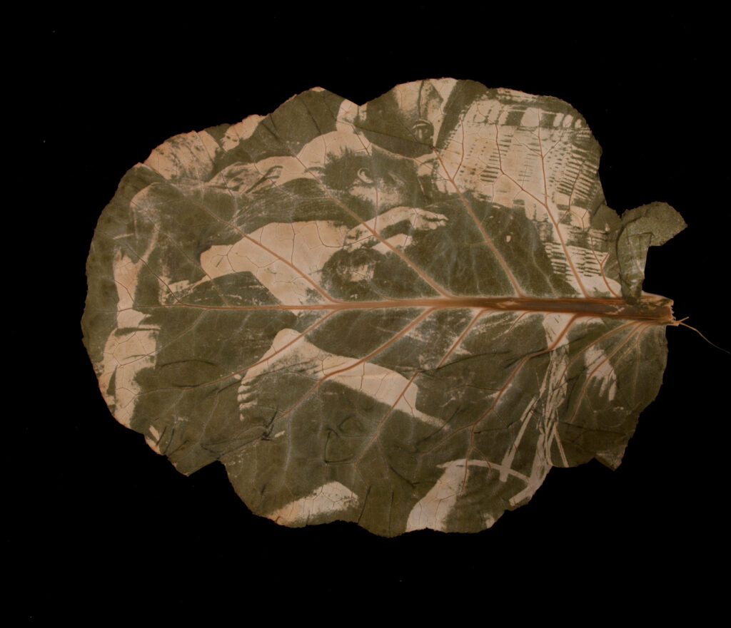 In this series, I inscribe images of the Vietnam War onto and into tropical plant leaves. One summer, I became inspired to experiment with photosynthesis and plant pigments after noticing how grass changed color beneath a garden hose left out on the lawn. That observation led me to create my first chlorophyll prints.