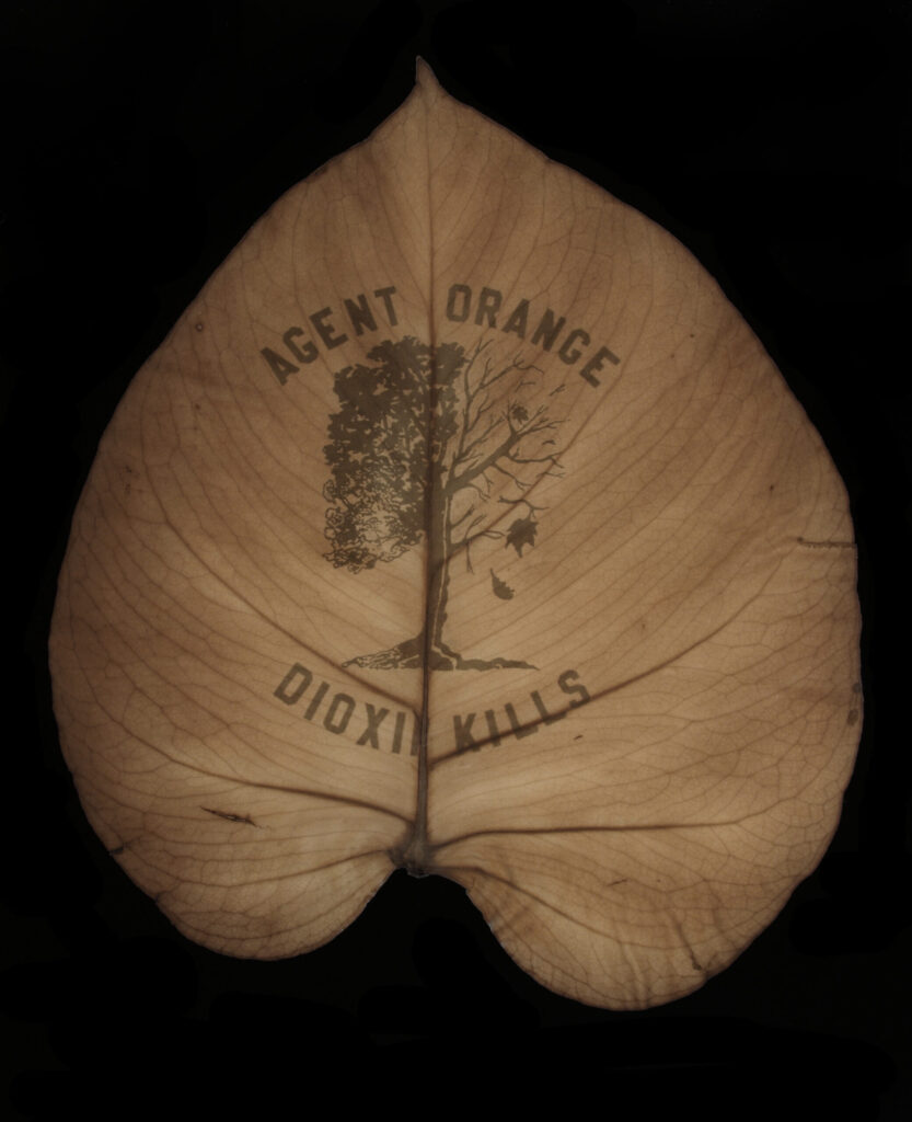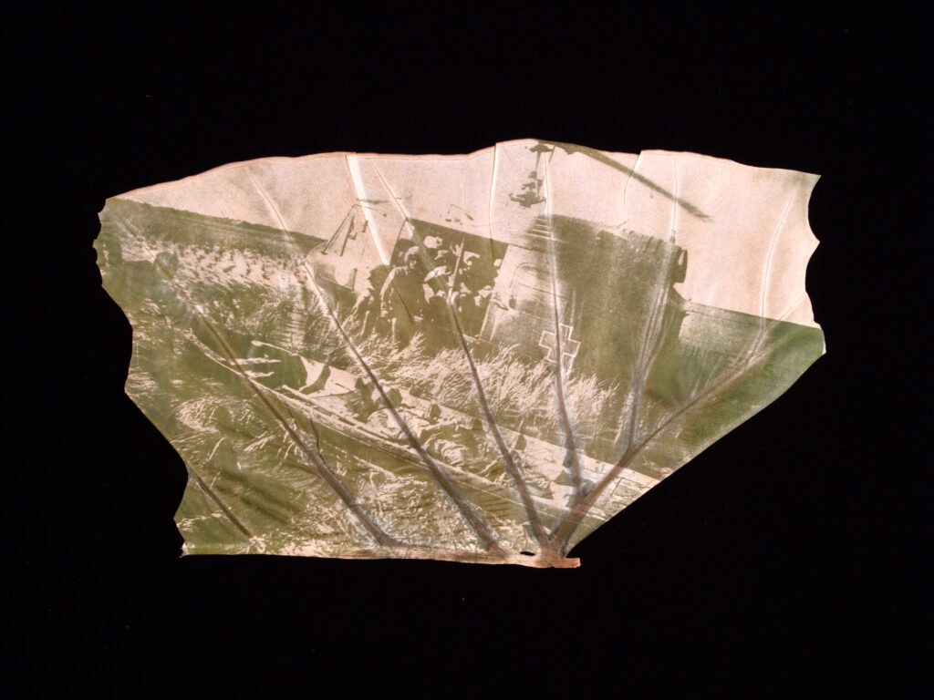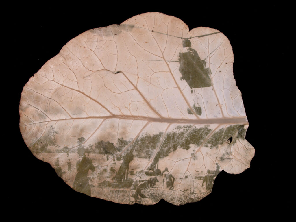 At its core, this work explores the idea of elemental transmigration: the decomposition and recomposition of matter into new forms. The war images don’t merely rest on the surface of the leaves—they are embedded within them, part of the organic material. The leaves carry the continuum of war. They hold the residue of the Vietnam War: bombs, blood, sweat, tears, and metal. The dead have returned to the soil, becoming part of Vietnam’s landscape through cycles of birth, decay, and renewal. As matter is never created or destroyed—only transformed—the physical and psychic remnants of the Vietnam (American) War persist in the land. Through this transformation, war becomes inseparable from the living environment.